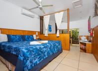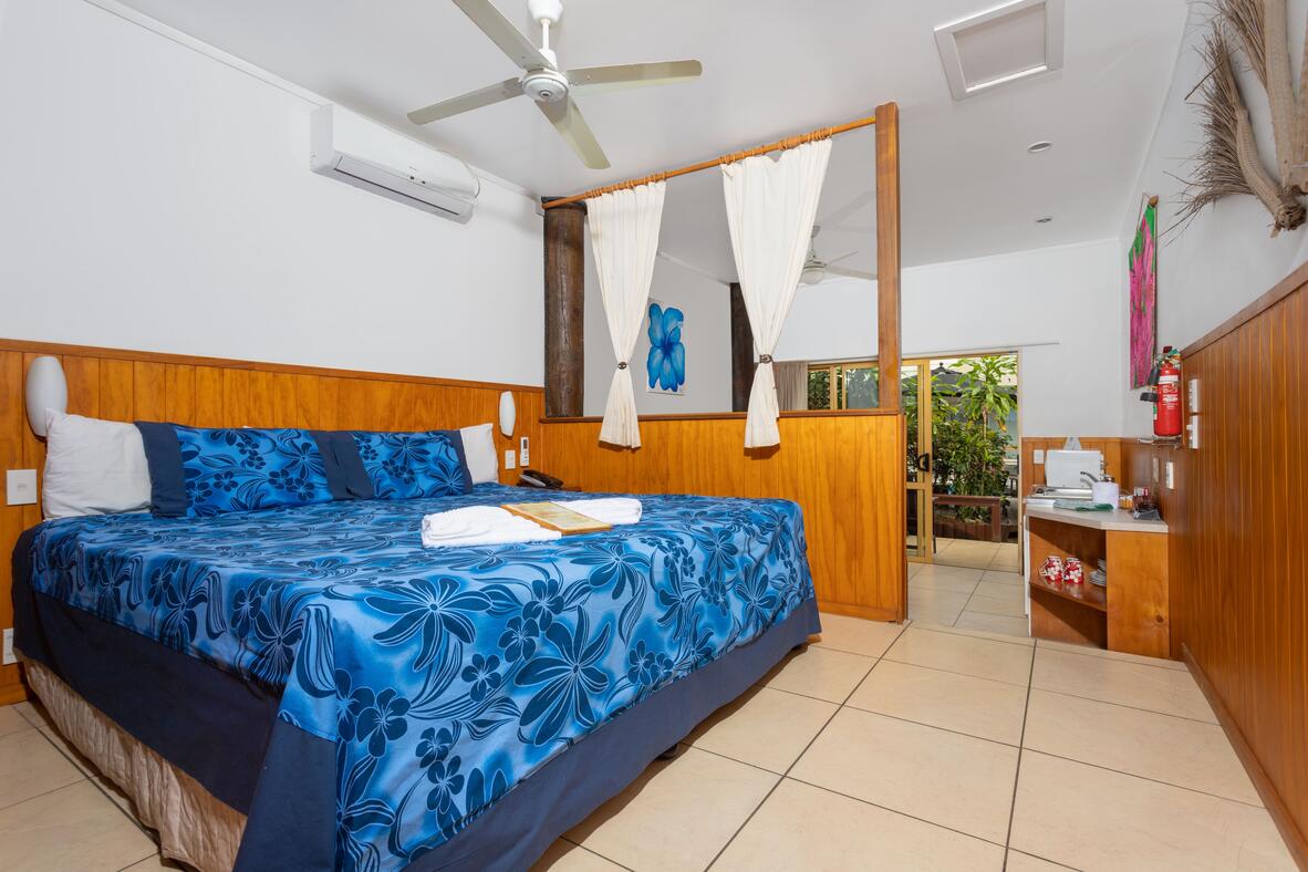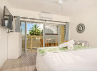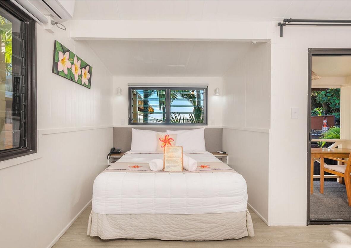 Settle into the spacious 29m²Beachside Studio, featuring an open-plan layout that flows onto a private balcony just steps from the beach and lagoon, offering partial ocean and sunset views behind Castaway Resort’s beachfront restaurant and bar. Each studio includes a self-catering kitchen, air-conditioning, ceiling fans, insect screens, a queen bed with a fold-out couch for an additional guest, essential in-room amenities, and a spacious tiled bathroom with complimentary toiletries and a hairdryer.
