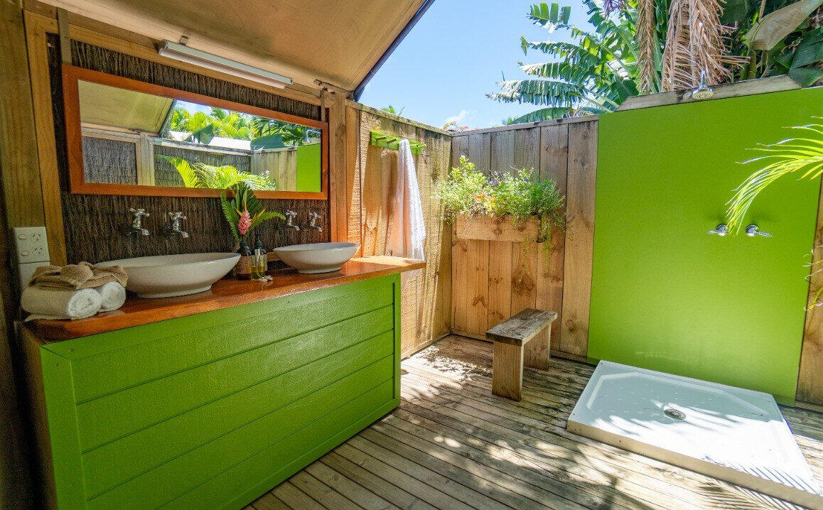 Our three Luxury Safari Tents are perched upon private timber decks overlooking the Ikurangi site, perfect for a sundowner or getting into a good book. With views of the Takitumu mountain ranges and private outdoor showers, you really can appreciate the natural beauty of our island. Each tent is equipped with home comforts such as power points for charging electronics, hairdryers, iron/ironing board, hot water, tea and coffee making facilities and a bar fridge. A super king bed complete with luxury linens ensures total relaxation.
