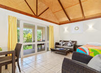 Our One Bedroom Superior bungalows are set in our garden area, facing the lush mountainous interior of southern Rarotonga. The interiors have tiled floors, bamboo-ply ceilings and modern furnishings. These bungalows cater to a maximum of 3 people and children under age 6 stay for free. Bungalow amenities include: full kitchen (fridge/freezer, gas cooktop, microwave, kettle, toaster, crockery/cutlery), bathroom with shower, premium superking bed, airconditioning, ceiling fan, flatscreen TV, telephone, room safe, and private deck.