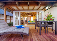 The 7 Garden Studio bungalows are situated around the swimming pool, in amongst flowering foliage. The interiors have tiled floors, bamboo-ply ceilings, and modern furnishings. These bungalows cater to a maximum of 3 people and children under age 6 stay for free. Bungalow amenities include: full kitchen (fridge/freezer, gas cooktop, microwave, kettle, toaster, crockery/cutlery), bathroom with shower, premium superking bed, airconditioning, ceiling fan, flatscreen TV, telephone, room safe, and private patio.