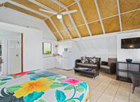 Our Beachfront Studio bungalows feature stunning views from the private balcony as they are set directly on the white sand of our beautiful beach. The cozy interior has hardwood floors, bamboo-ply walls, and modern furnishings. These bungalows cater to a maximum of 2 people (no children under age 6). Bungalow amenities include: full kitchen (fridge/freezer, gas cooktop, microwave, kettle, toaster, crockery/cutlery), bathroom with shower, premium superking bed, airconditioning, ceiling fan flatscreen TV, telephone, room safe, and iron/ironing board.