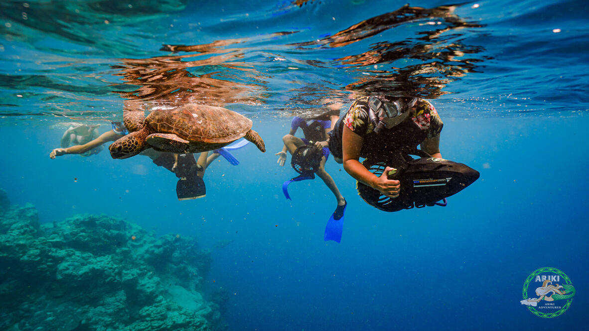 Your encounter with a Sea Turtle in the wild is one of the most amazing experiences! Immerse yourself into their natural marine environment and get up close and personal. Learn about the coral reefs, the habitat and what is being done to protect this resource for future generations. Each client will use a unique, eco-friendly sea scooter to help pull you through the water and assist during this tour.