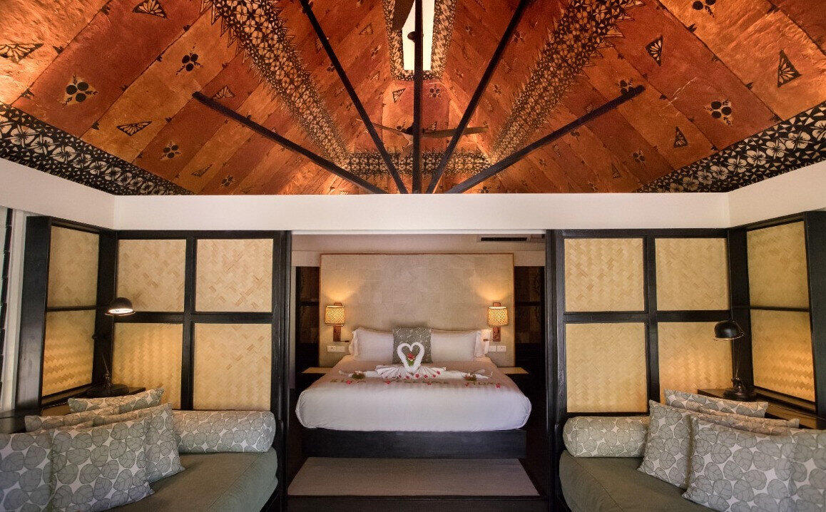 The Ocean View South Bures with private patio are close to the beach front and allow for ocean views, all while being nestled amongst the resort’s lush tropical gardens on the islands South Beach. Each free standing, traditionally thatched bure features a high vaulted hand painted ‘tapa’lined ceiling, air-conditioning, ceiling fans, large bathroom with shower and plenty of space.