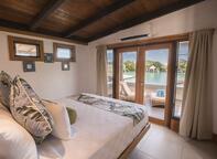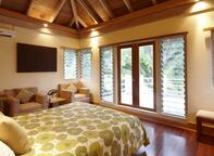 The Edgewater Villas are located partially over the water, in our family friendly area of the Edgewater Lagoon. You’ll enter the two story villa through a private garden with your own plunge pool, sundeck and bridge over the pool. The lower level includes a relaxing living area furnished with soft leather and palm woods, complete with a full kitchen, dining room, media room with flat screen TV & DVD player, and a full bath. The leather couch in the media room is equipped with a fold out bed. Right off the living room you can access the ocean from your deck with ladder to Koro Bay. The whole second floor is the master suite with a king sized bed, leather lounge, and private rooftop deck overlooking Koro Bay lagoon.