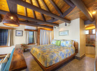 Located over our lily ponds near the rainforest’s edge, these villas are a great addition to modern accommodations for a family with three bedrooms and two bathrooms in a setting along the stream. The lower level of this villa includes two separate bedrooms with queen beds, sharing one bath with outdoor shower, as well as a full kitchen, dining room, and living area with flat screen TV & DVD player. The second floor is the Master Suite with a King sized bed, twin vanities and master bath with large soaking tub. The master bedroom is appointed with a rooftop deck overlooking the stream, under shady raintrees.