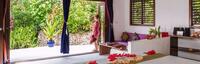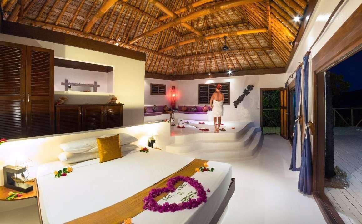From the stunning hilltop deck wrapping around Bure 1, you can feast your eyes on stunning panoramas of the South Pacific, with unparalleled visibility extending to the furthest islands of the archipelago. Just steps from the sandy beach, Bure 3 is enveloped by a lush garden, blossoming year round with fragrant, tropical Hibiscus and Frangipani. Each of the Grand Bures are equipped with an oversized soaking tub in the living area. Every day the soaking tub is uniquely prepared by our masseuses with scented oils, dried flowers and floating candles.