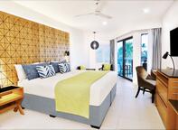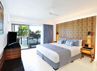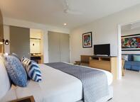 These rooms combine both a Superior Room and a One Bedroom Suite with a total living space of 119m2 and are on the 2nd or 3rd floors, with a sliding door onto your balcony with lagoon pool or partial ocean views. .The outer foyer doors at the entrance to each Guest Room and One Bedroom Suite combination, allows guests private access between the two rooms, whilst still enabling each to have their own privacy. They feature a full kitchen (with dishwasher, microwave, stove, and full sized refrigerator), separate lounge with sofa, television, four seater dining suite, separate bedroom with a second television and in room safe, bath amenities, bathrobes, hair dryer, large bathroom with double sink, separate shower and bath, washing machine, dryer, generous patio or balcony, and free WiFi.