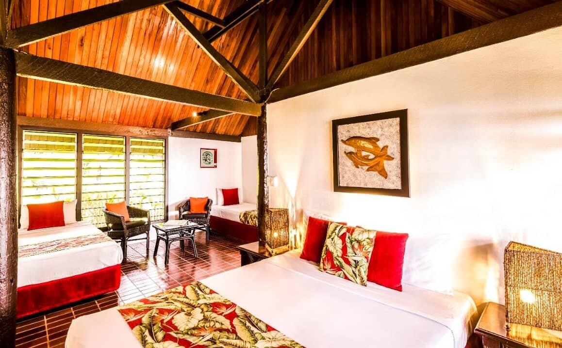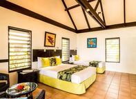 The Beachfront Bures are perfectly positioned to catch gentle sea breezes and provide a beachfront view of the South Pacific Ocean. Surround yourself with the fresh air and sunshine of Fiji, with its tropical gardens reflected in the comfortable red and green island décor of your personal bure. Your private villa features a spacious bathroom with shower.