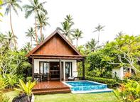 The Beachfront plunge pool bures provides a private oasis complete with personal plunge pool and incredible views of the South Pacific Ocean. Featuring both an indoor bathtub as well as an outdoor shower, they are ideal for couples seeking an intimate, romantic setting. The simple yet elegant décor features dark woods against a light background, highlighted by red and green tropical accents. Your private villa also features lush views of the tropical gardens.