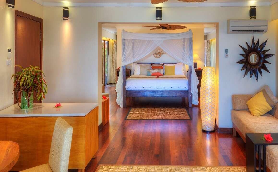 The Beachfront Pool Suite offers a beachfront location, spacious indoor and outdoor living areas with a mix of traditional Fijian design and relaxed contemporary style. Situated on the ground floor of a duplex villa, these 60sqm lower suites each feature a spacious living room area, king bedroom which has a 4-poster bed with en suite bathroom that features a separate shower and spa bath. Located in a tropical garden setting featuring an outdoor courtyard with a private double outdoor shower, pool side pavilion/cabana with a double sunlounge bed and sun lounges by the plunge pool and direct beach access just steps away. Perfect accommodations for singles or couples with or without children.