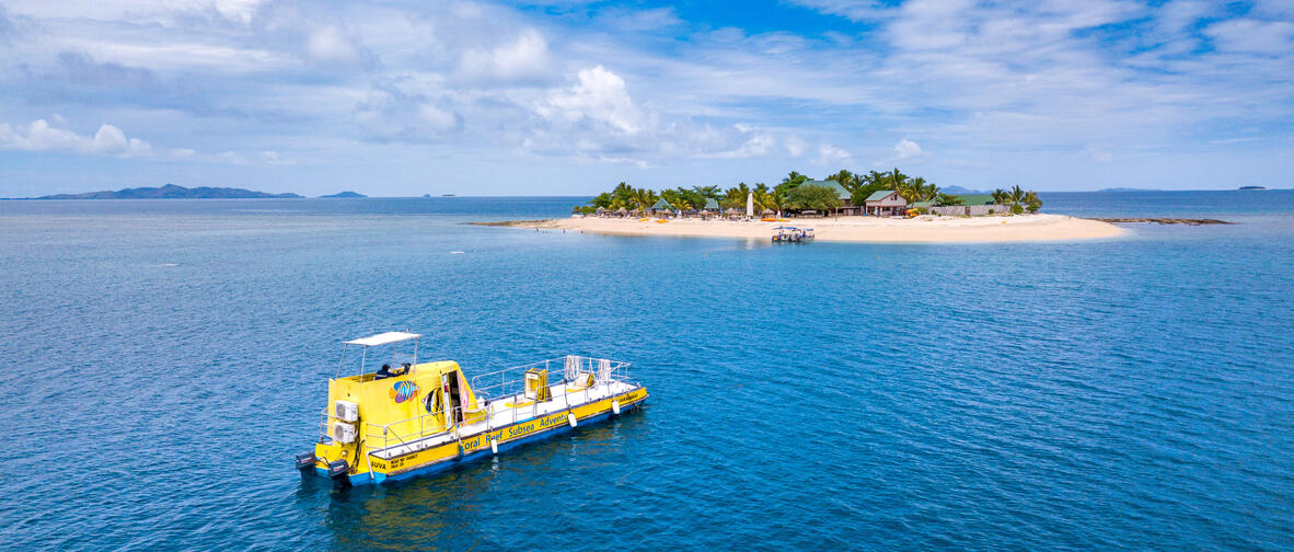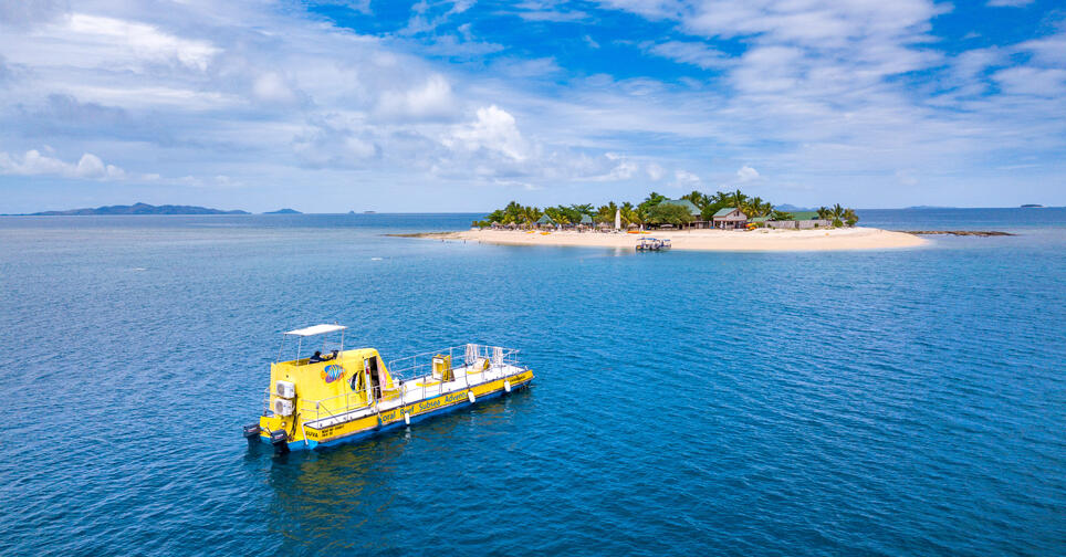 A fun family day in Fiji! South Sea Island is perfect for families with small children! If you would like a short trip out to South Sea Island to suit the kids, then this is the cruise for you. In just 30 minutes you'll be at South Sea Island where you can spend two hours and be back at Denarau in time for lunch. In the two hours, you can see the stunning underwater world of the Marine Sanctuary that surrounds the island with its colourful coral and magnificent fish life. You don't even have to get wet as we'll take you to view all this in our semi-submersible vessel. You sit beneath the surface viewing the coral and fish through large panoramic windows. Then spend some time ashore relaxing, go kayaking, take a swim in the pool or go snorkelling.