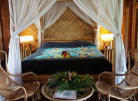 These two one-storey Villas are architecturally unique with exterior walls of the living and bedrooms constructed entirely of poles and glass, split level design, exposed-beam pole ceilings and 180 degree views, all enhanced with local hardwoods, finely crafted lava rock walls, and beautiful quartzite tile. A large bedroom with walk-in closet features a king size bed, and opens to a comfortable sitting room and a writing alcove. The large open-air style bathroom comes complete with Coconuts’famous lava rock ‘waterfall’shower. This is the ultimate in Samoan style and luxury!