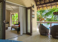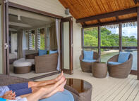 Situated at the eastern end of the bay, resting on the sea wall with cantilevered decks and 180‐degree views of the lagoon and the ultimate in luxury. Relax in your large round daybed in a spacious courtyard, with the sound of the South Pacific lapping against the rocks beneath you. Step inside as soft flowing fabrics frame the villa, elegant furnishings including a comfortable day bed (full single size) for when relaxing indoors, private dressing room and a bathroom with a shower that looks right into the lagoon are all standard features. This villa also boasts a hot water outside shower in addition to the internal shower giving an option of inside/outside bathing. As evening falls serenaded by the sounds of the ocean, enjoy cocktails in your private tropical courtyard or waterfront deck; feel special –as special as your location.