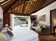 The Garden Pool Bungalows are set within the tropical gardens of the resort and features an enclosed private terrace with sunloungers and plunge pool, just perfect for relaxing. The Polynesian-style bungalow is spacious inside with the Polynesian themed decor continuing throughout. There is a seating area alongside the bed and a marble bathroom with rain shower and separate bath tub. These bungalows are ideal for families as they can stay in two adjoining bungalows or even connecting bungalows.