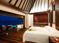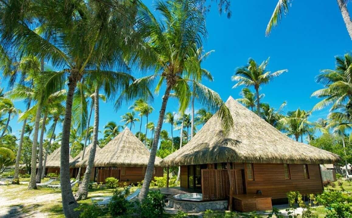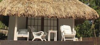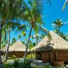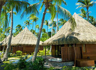 A private Polynesian-styled bungalow situated along the white sandy beach, the Beach Bungalows are nestled amongst the coconut trees with a stunning outlook overlooking the beach and lagoon from the terrace. Laze on the terrace on the sunloungers or take in the view while soaking in the outdoor jacuzzi. Inside there is a seperate sitting area and spacious bathroom, all decorated in a natural styling with local arts and crafts, pearls and coral.