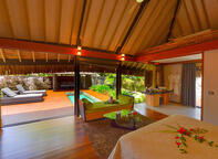 Pure privacy awaits when you stay in the Villa with pool. Surrounded by white coral walls, the total complex features a private garden, a private pool, terrace and a gazebo - called the falepote - and an open-air bathtub. Enjoy sunbathing on the terrace or stargazing from the bathtub. When you are ready to venture inside the villa has a bedroom, living room and shower room all in one area, giving the room a spacious feeling during your stay. The locally made Polynesian-style decor and furniture create a gentle and comfortable atmosphere that combines well with the outdoor setting.