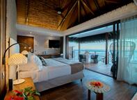 Built around the resort's private motu, these bungalow suites offer the best views out across the water towards Moorea. Their spacious deck is perfect for relaxing on while admiring the views and also allows direct access to the lagoon below. Inside there is a separate lounge, bedroom and white bathroom.