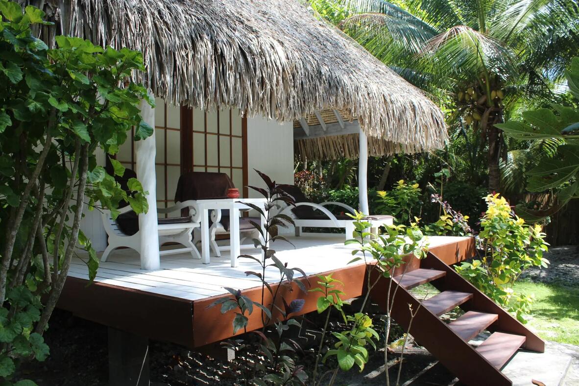 The 7 bungalows have a view of the gardens or Tiputa pass. Each bungalow is fully equipped with king size four poster bed with ensuite, fridge and fan. Enjoy the view from your own private terrace.