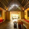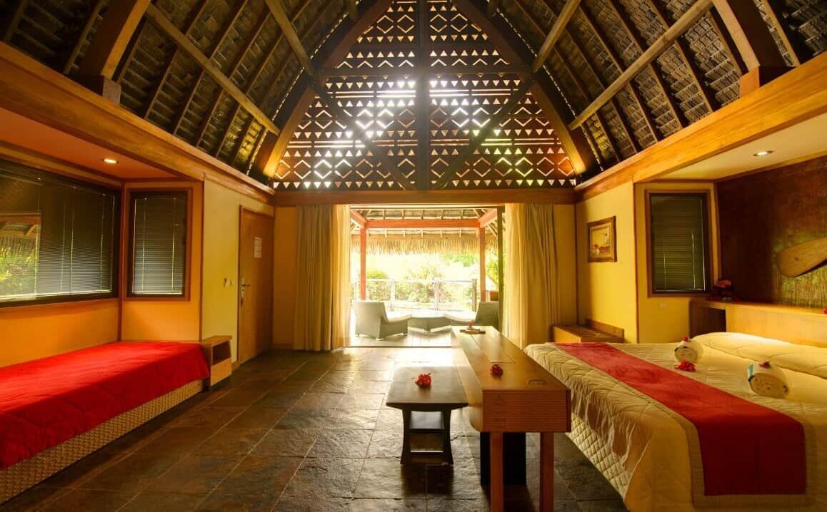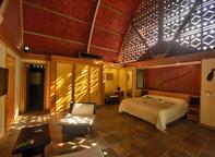 Perched on the shoreline of the lake located within the resort's grounds, these bungalows are built in a traditional Tahitian style and feature finishes such as a thatched roofs, dark woods and tapa designs. A large private terrace overlooks the lake and offers views of the mountains that dominate the island of Huahine. Inside the bungalow there is a comfortable living space, separate bathroom and tropical decor.