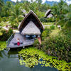 Perched on the shoreline of the lake located within the resort's grounds, these bungalows are built in a traditional Tahitian style and feature finishes such as a thatched roofs, dark woods and tapa designs. A large private terrace overlooks the lake and offers views of the mountains that dominate the island of Huahine. Inside the bungalow there is a comfortable living space, seperate bathroom and tropical decor.