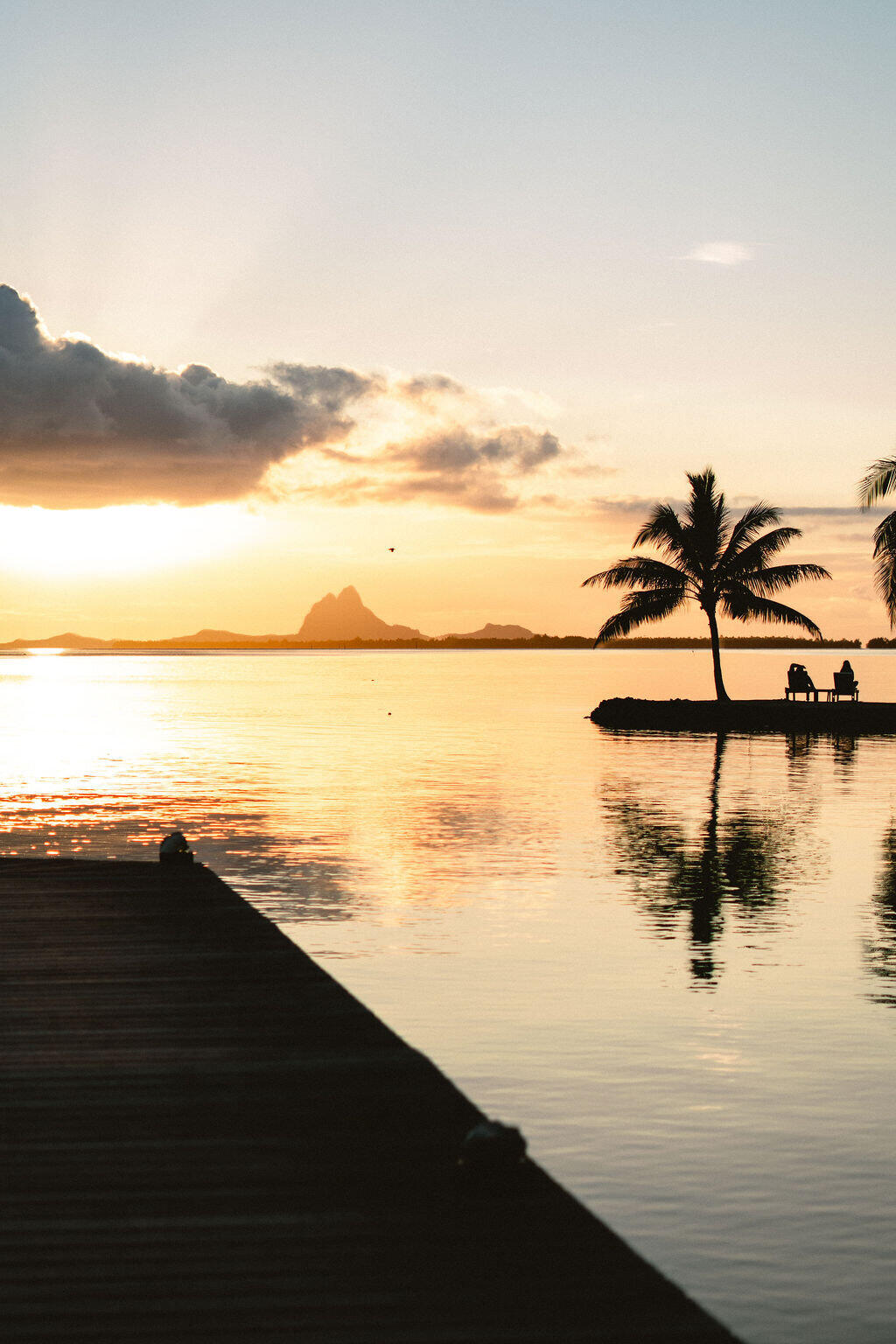 Our overwater bungalows, built with traditional wood and locally sourced materials, combine warmth and elegance to create a genuine haven of relaxation. Their privileged setting offers an immersive experience above the lagoon, with sweeping views of Bora Bora and Taha’a. From the private terrace, guests can take in the crystal-clear waters and the spectacular Polynesian sunsets. Inside, a glass-topped coffee table reveals the vibrant marine life below, fostering a serene and seamless connection with the surrounding nature.