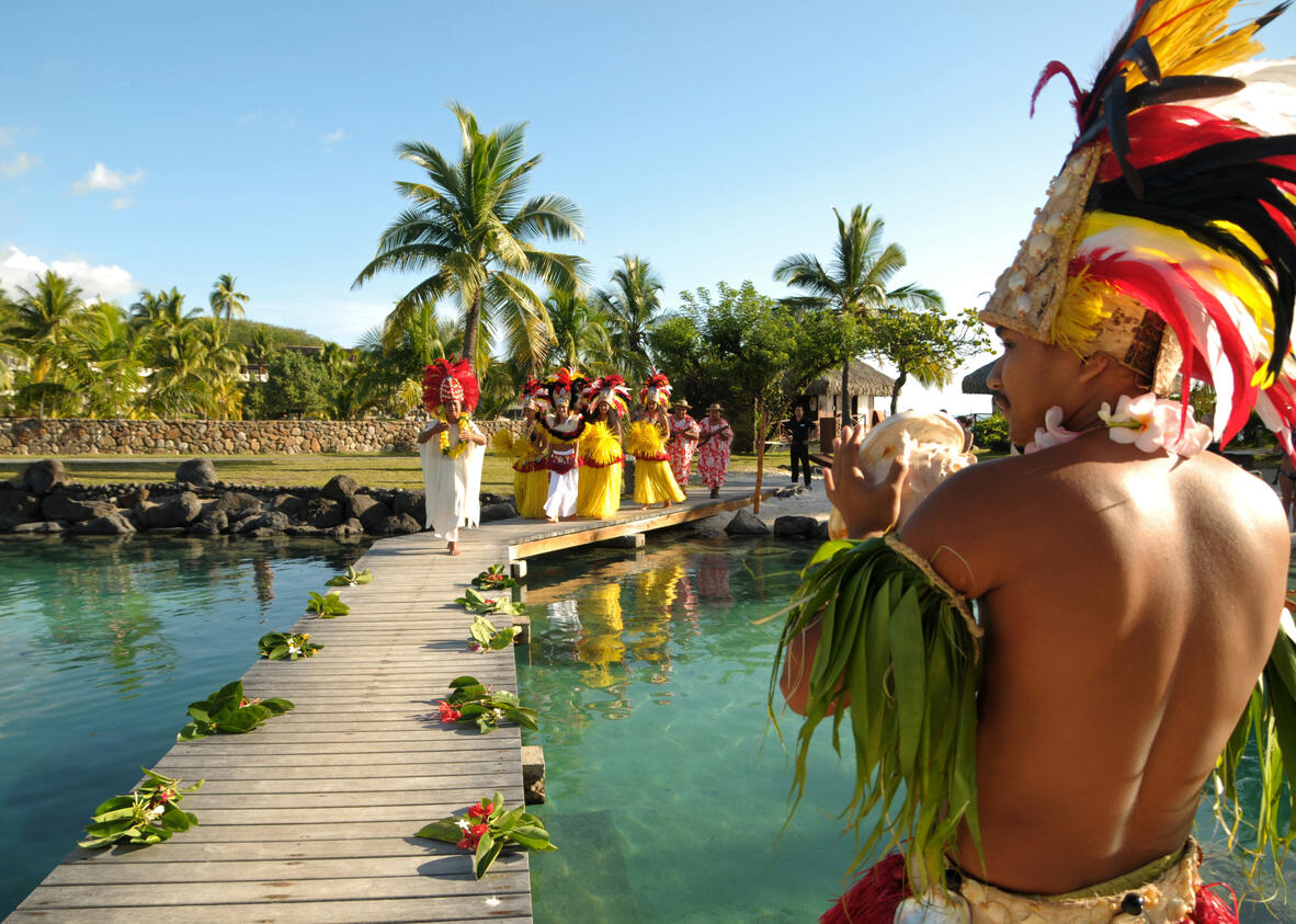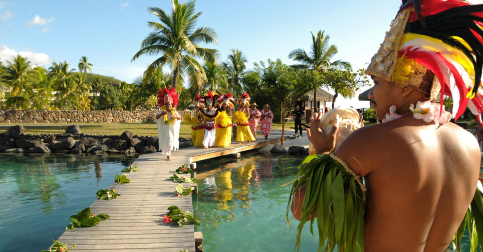 Celebrate your wedding on the main motu stage as the bride is escorted by dancers and traditional music to join the groom at the altar, where a Polynesian priest blesses your union through ritual ceremonies, the exchange of flower crowns and Polynesian names, before the celebration continues with Tahitian dance and Champagne and wedding cake.