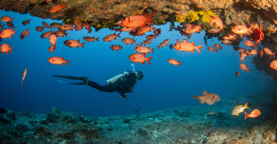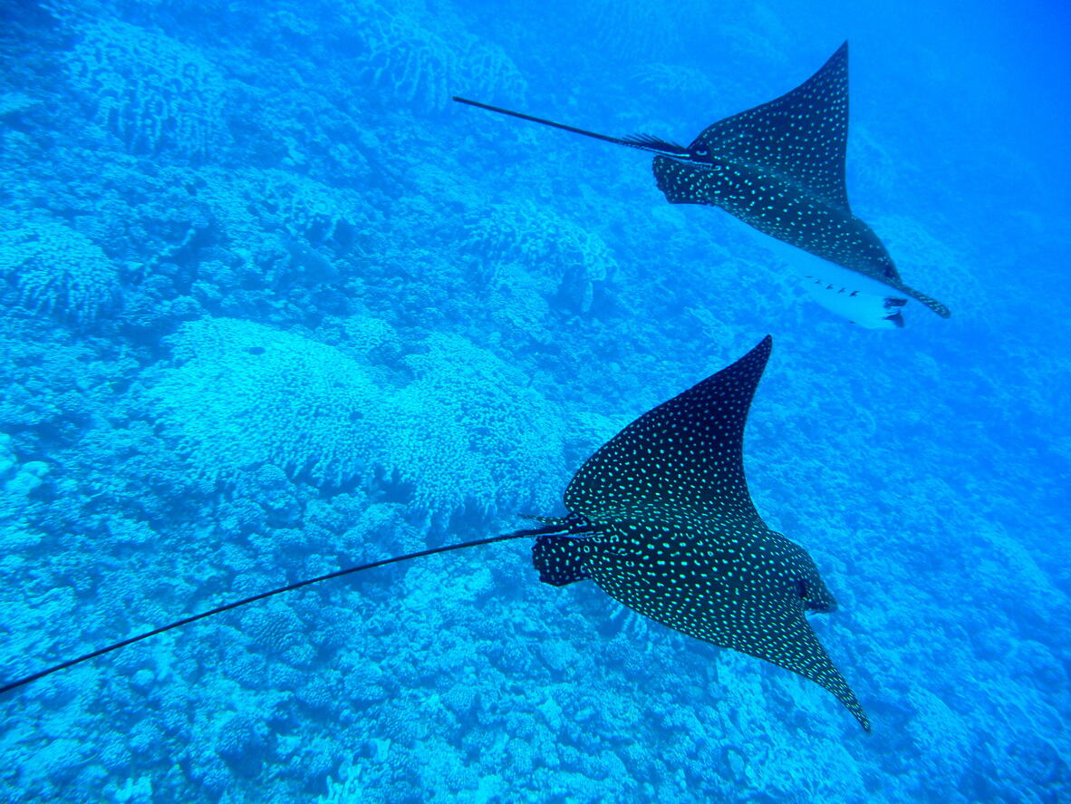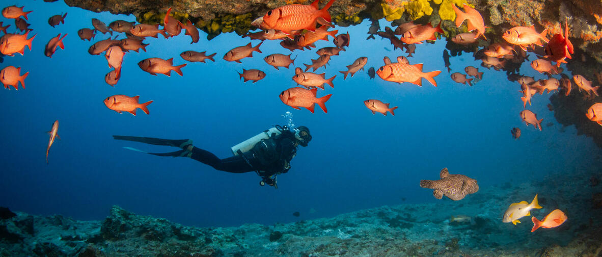 Rangiroa Atoll: One of the largest atolls in the world, Rangiroa is renowned for its spectacular drift dives and crystal-clear visibility. Divers can experience encounters with large pelagic species, including dolphins, tuna, and even the elusive whale shark. The Tiputa Pass is famous for its strong currents, where you can experience the thrill of diving with schools of sharks and rays.