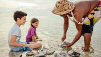 family bathing on a sandy beach and snorkeling. Boats such as stand-up paddles and canoes are available free of charge. A safe
