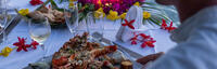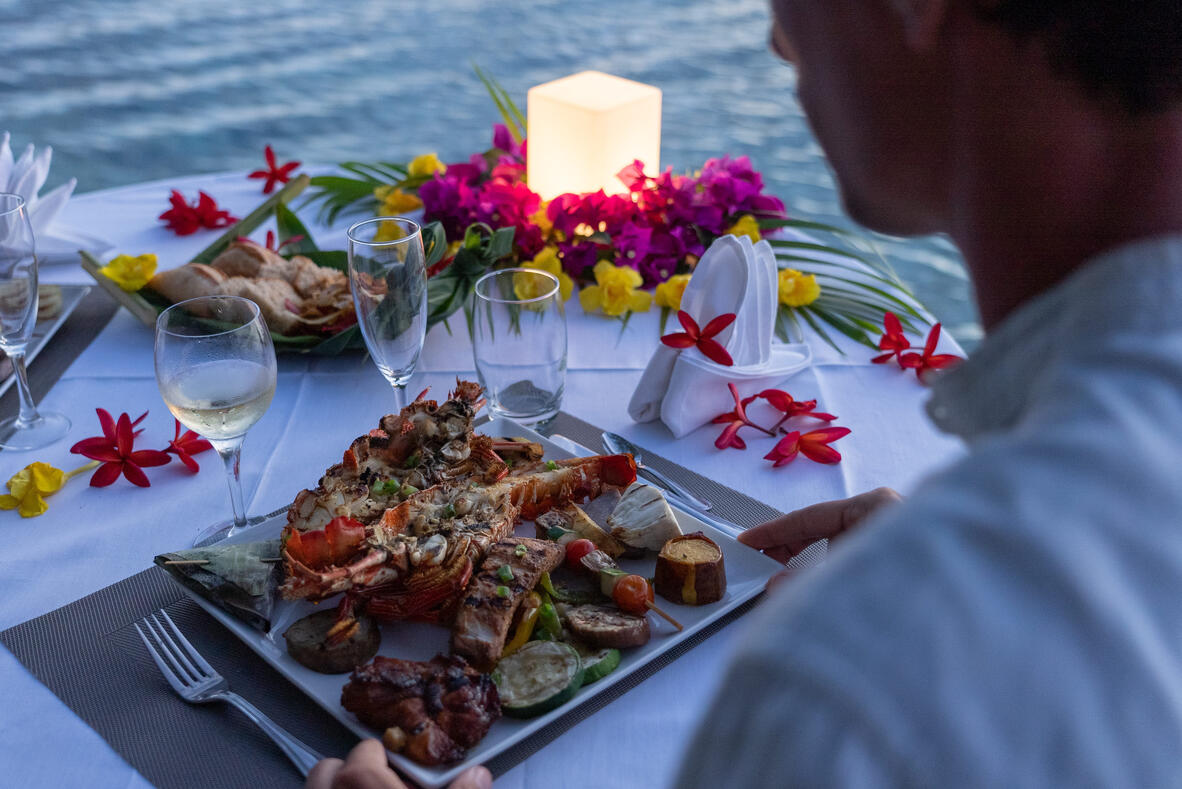 ● Dinner for departures during May through to January will be based on a Lobster Menu - breadfruit cheesy cromesquis with herbs dip, local shrimp with ginger creamy bisque, lobster from Marquesas island with garlic butter sauce sweet patatoes and vegetables, coconut mousse and vanilla pineapple on Breton shortbread, beverages (Champagne, homemade punch, white wine, red wine, beer, soft drinks and water).