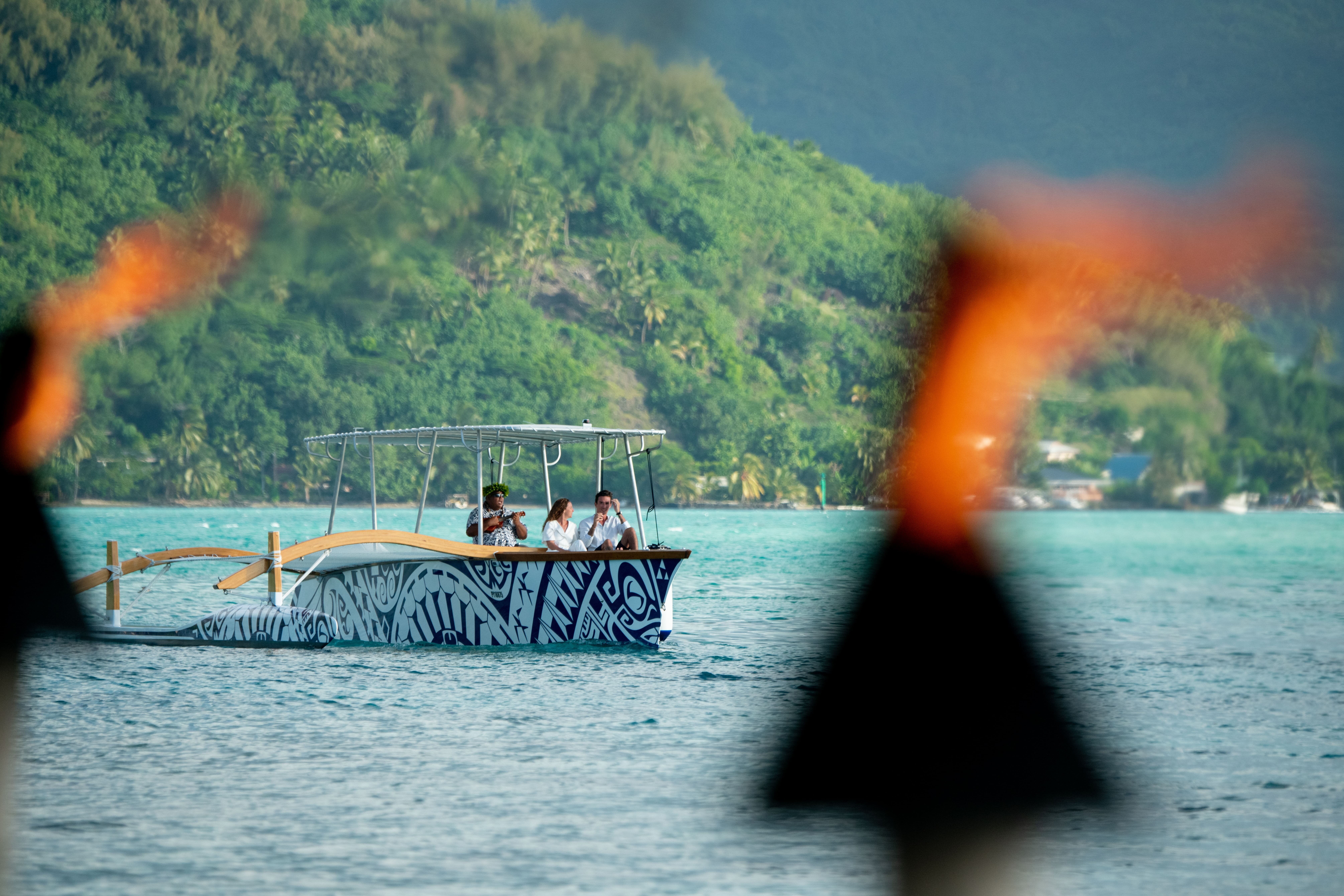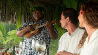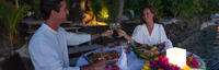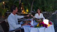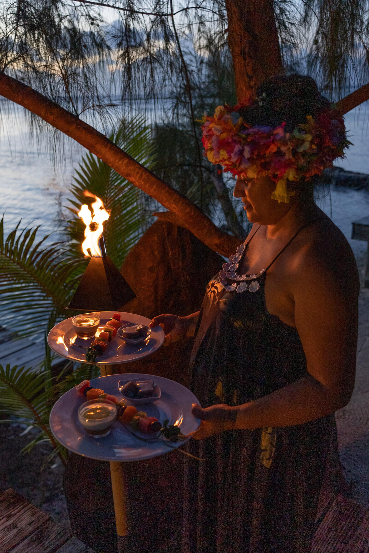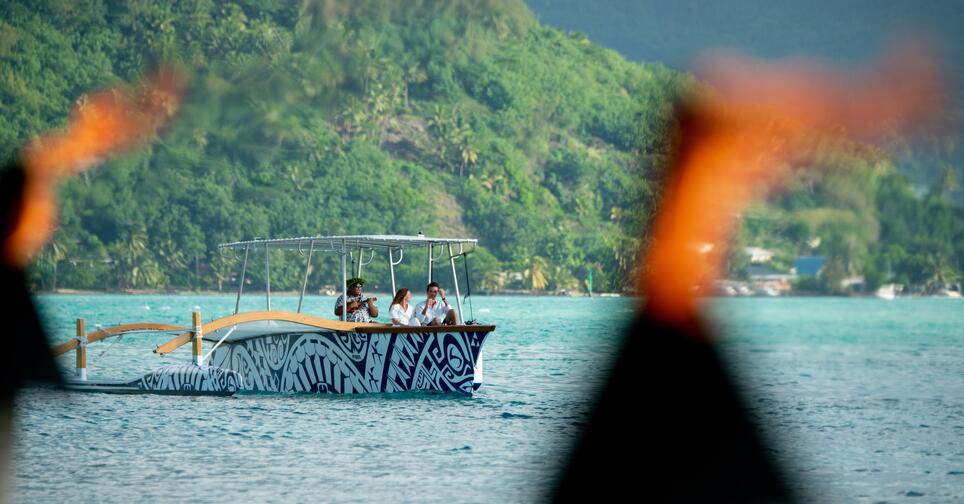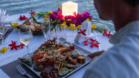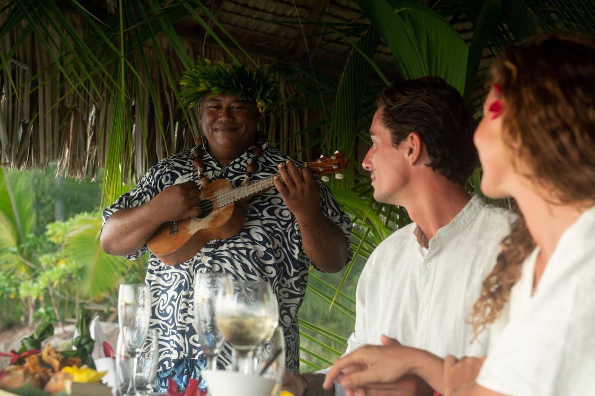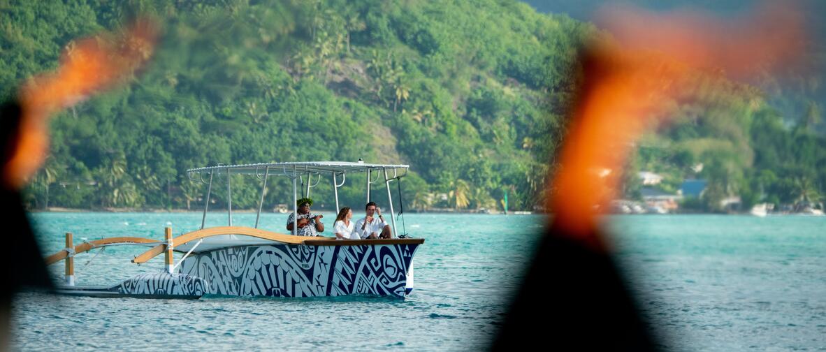 Come and enjoy a unique experience aboard a luxury traditional pirogue and take in the beauty of Bora Bora's idyllic lagoon at sunset. As night falls, your guide will take you to a private motu, where you and your loved one can experience a romantic dinner under the stars. A hostess will greet you and escort you to your table, set facing the lagoon, where you can enjoy your meal, with personalized, quality service. Enjoy the moment in an intimate setting, to the sound of the ukulele and Polynesian ballads proposed by your guide.