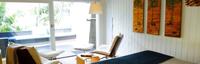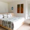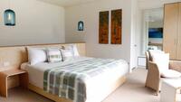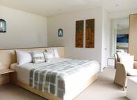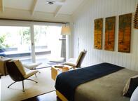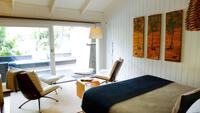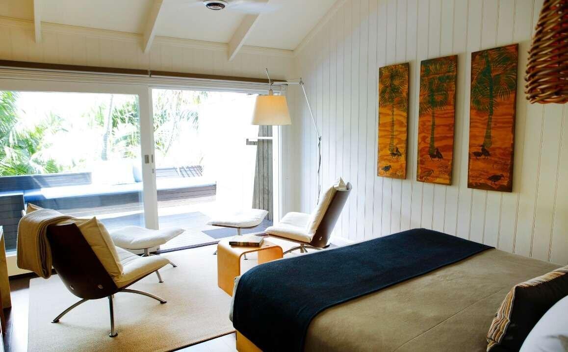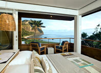The Capella Suite features high ceilings with a beach house feel, offering cameo views of the ocean and mountains with kentia palms waving outside. Guests find a stylish refuge in this single level space, featuring king or twin bed options, a spacious ensuite bathroom, lounge area, outdoor deck with day bed and dramatic mountain and ocean views. A chic basalt dressed ensuite offers natural sky lighting and an oversized shower with generous dual heads allowing guests to rejuvenate in the remarkably soft, pure Lord Howe rainwater.