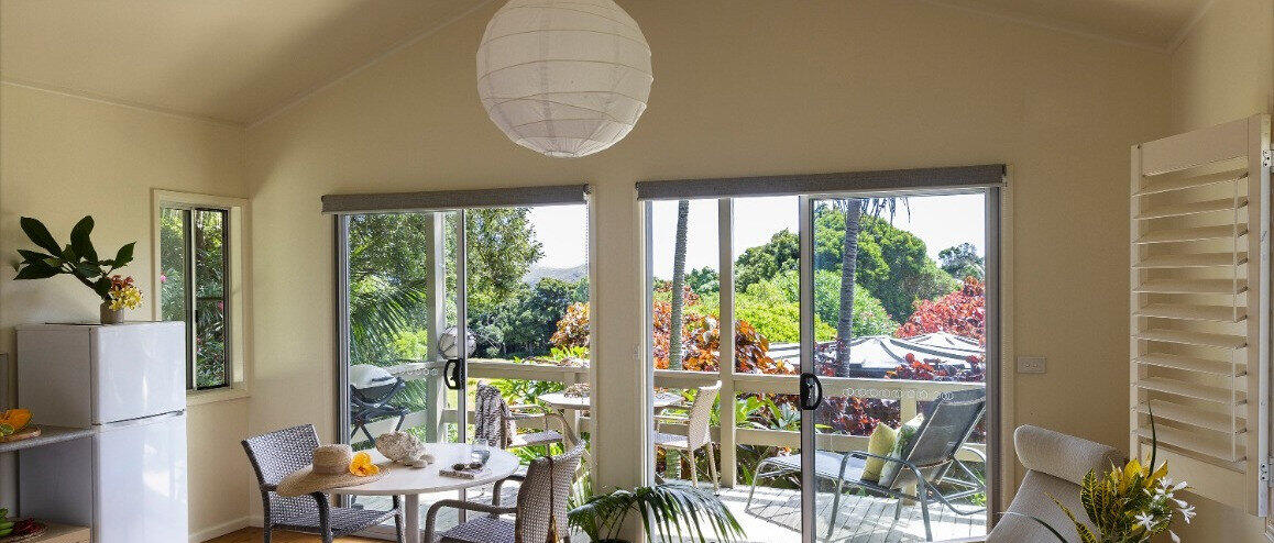 This unit offers very private accommodation, being separate from the garden units. The unit is elevated with a view to the north of the Admiralty Islands. All the rooms have full kitchens with a gas cooktop and oven, separate living, bedroom and ensuites. There are no TVs at Ebbtide but there is an excellent library, bluetooth speakers and iPod docks in each unit.