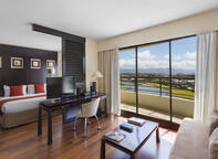 Superior Suites are 38 square metres with a 4 square metre terrace and are located on the 4th to 17th floors. They have a separated bedroom, lounge area, bathroom with hydro massage shower and a fully equipped kitchen. Enjoy views of either the racecourse or Sante Marie Bay.
