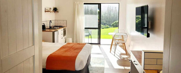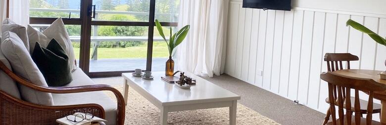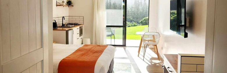 One Bedroom Apartment: The one-bedroom apartments provide extra space and comfort, making them ideal for couples or solo travellers who enjoy a little more room. Each features a private covered rear deck complete with a barbecue and outdoor seating –perfect for alfresco dining and soaking up Norfolk’s fresh air. Inside, you’ll find a fully equipped kitchen, a modern bathroom with a walk-in shower, and relaxed living areas designed for longer stays.