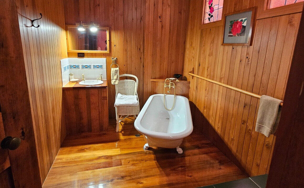 There are three separate and private bedrooms. These include a spacious queen size room with en-suite overlooking the orchard, a large king size room overlooking Ball Bay and the ocean (the King bed can be split into two King singles if required) and a smaller king bedroom with original furniture and French doors opening onto the verandah with views over Ball Bay and the Pacific Ocean. While the cottage is comfortable for six guests, it is also very cosy and romantic for two. One bathroom features a beautiful full sized free standing claw foot heritage bath. Guest will have exclusive use of the house and property.