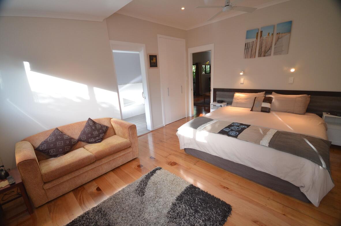 This is Norfolk Island's only 5 bedroom accommodation with 5 en-suite bathrooms (all with both spa baths and massage showers or just walk-in massage spa showers). The East Wing is available for larger groups and families, consisting of three connected ground floor villas (An Executive 1 Bedroom Spa Villa plus two Executive 2 Bedroom Spa Villas), sleeping up to 10 people comfortably with 5 bedrooms, 5 en-suite bathrooms & 3 living rooms. There's 42" LCD TVs in the living rooms, and most bedrooms have their own wall-mounted LED TV (with DVD & PVR). The 5 Bedroom Executive Spa Villa has its own private courtyard, BBQ and outdoor seating areas.