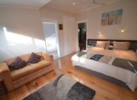 Cumberland Spa Villa is a luxury, modern and spacious two-storey four bedroom, three bathroom holiday house. The house is set in a tranquil garden setting and is ideal for groups or families seeking a quiet convenient location in the heart of town. There's two living rooms, three leather couches, a large living room with a huge Norfolk Pine table with eight leather dining chairs. One bedroom is downstairs (with en-suite bathroom), the other three bedrooms are upstairs. Enjoy use of two LCD TV's: living room has one 47" flat screen LCD TV, CD & DVD players, the master bedroom also has its own LED TV. The three bathrooms have a bathtub, separate spa bath, heated towel rails, and Egyptian cotton towels. There's a private car port, private free laundry, cathedral ceilings, halogen lighting, private recreation area, wrap-around verandah, and private BBQ. Fully equipped, large kitchen with stone bench-top, stainless steel dishwasher, and every conceivable appliance.