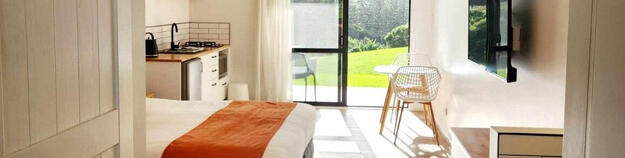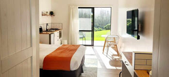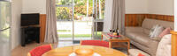 The fully self-contained two bedroom apartments sleep up to four people. The bathroom has a shower, basin and bathroom amenities provided. The open plan design of the kitchen, living and dining room provides space and comfort to relax in. The kitchen is fully equipped complete with an oven, stove, microwave and refrigerator, or alternatively there is a large common barbeque area available for guest use.