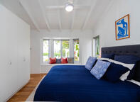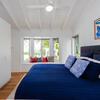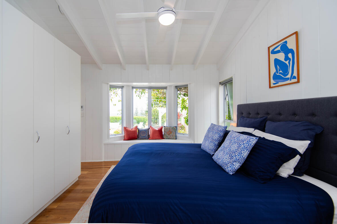 Luxurious linen features in in the king-size bedroom, where a gorgeous bay window provides views of the pool and towering Norfolk Pines beyond. A sliding door opens to a private balcony, which is a lovely spot to enjoy a morning cuppa.