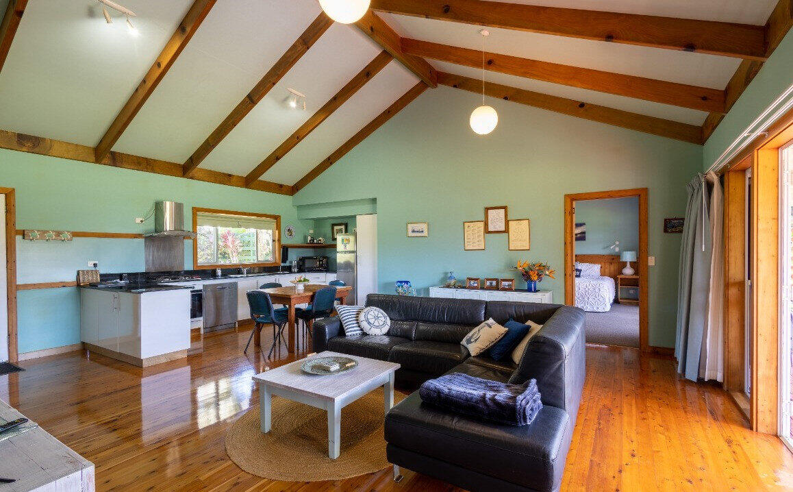 One-bedroom cottage: Trade Winds’ one-bedroom cottage sleeps up to three people. The spacious bedroom opens out to the open plan lounge and kitchen area, which in turn opens out to a breezy verandah where you can spend relaxing afternoons enjoying the scenery.