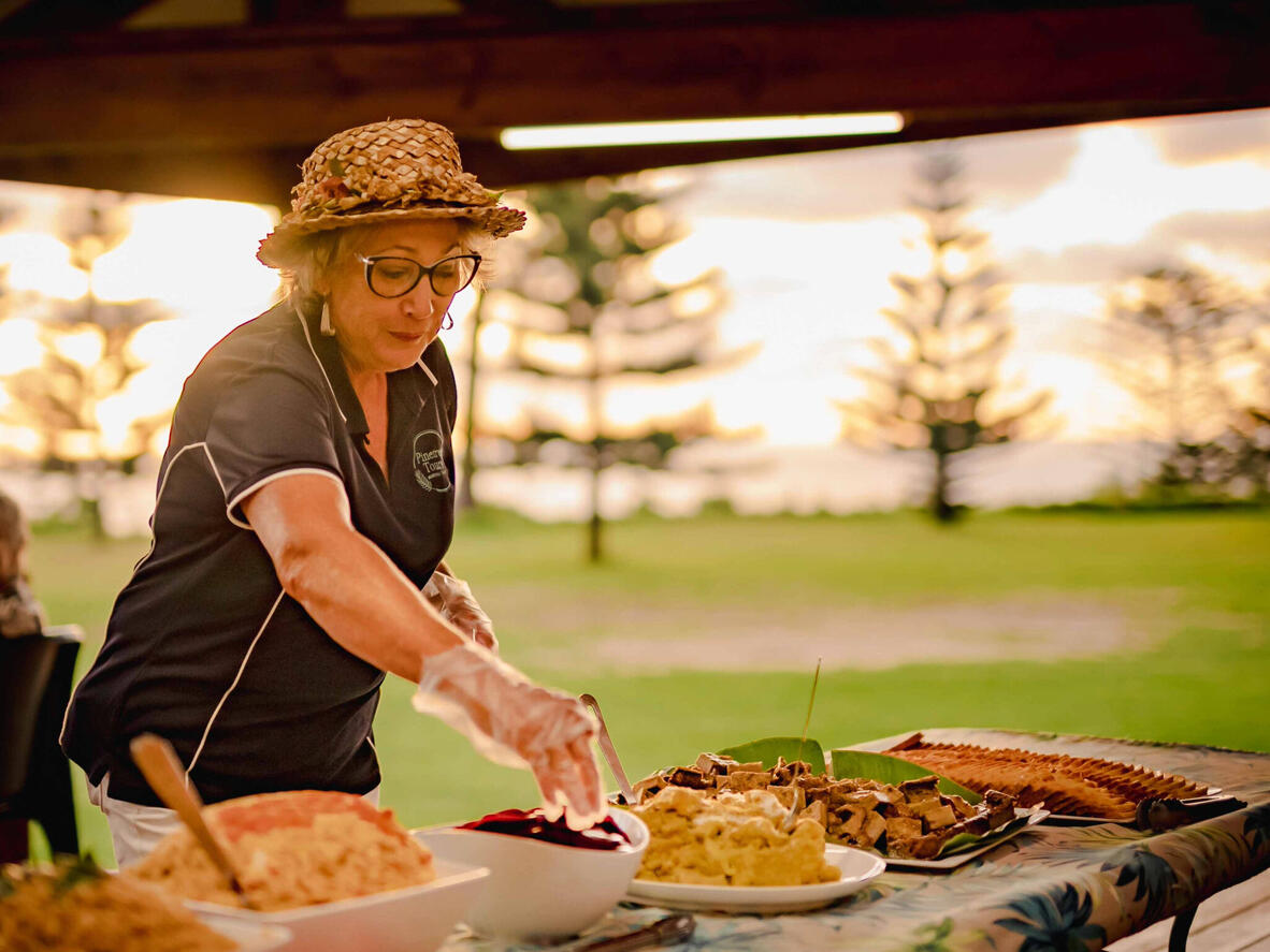 Enjoy a feast of island dishes, salads, homemade bread and fresh fried fish, followed by island desserts and tea or coffee. Watch the sun set from Pinetrees Tours' exclusive property 'Orn Daa Cliff' on Norfolk’s beautiful western coastline and enjoy some local entertainment.