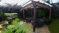 These two one-storey Villas are architecturally unique with exterior walls of the living and bedrooms constructed entirely of poles and glass, split level design, exposed-beam pole ceilings and 180 degree views, all enhanced with local hardwoods, finely crafted lava rock walls, and beautiful quartzite tile. A large bedroom with walk-in closet features a king size bed, and opens to a comfortable sitting room and a writing alcove. The large open-air style bathroom comes complete with Coconuts’famous lava rock ‘waterfall’shower. This is the ultimate in Samoan style and luxury!