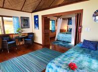 One bedroom private oceanfront bungalow or adjoining unit equipped with ensuite tiled bathroom, wood floors or tiled, queen bed and lounge or one single, on request only king bed +2 x king singles, air-conditioning and ceiling fans, bar fridge and electric jug, water filter, private balcony.