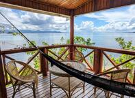 There are two Family Bungalows laid out in a duplex style. Each bungalow has two bedrooms, a master bedroom with a queen sized bed and a second bedroom with three single beds. Each bungalow also has it's own verandah with a hammock and stunning views out over the clear water towards Kennedy Island and Mt Kolombangara. A special feature of these bungalows is a shared verandah with tables and chairs and a staircase to the beach - great for families travelling together or a lrage group of friends!