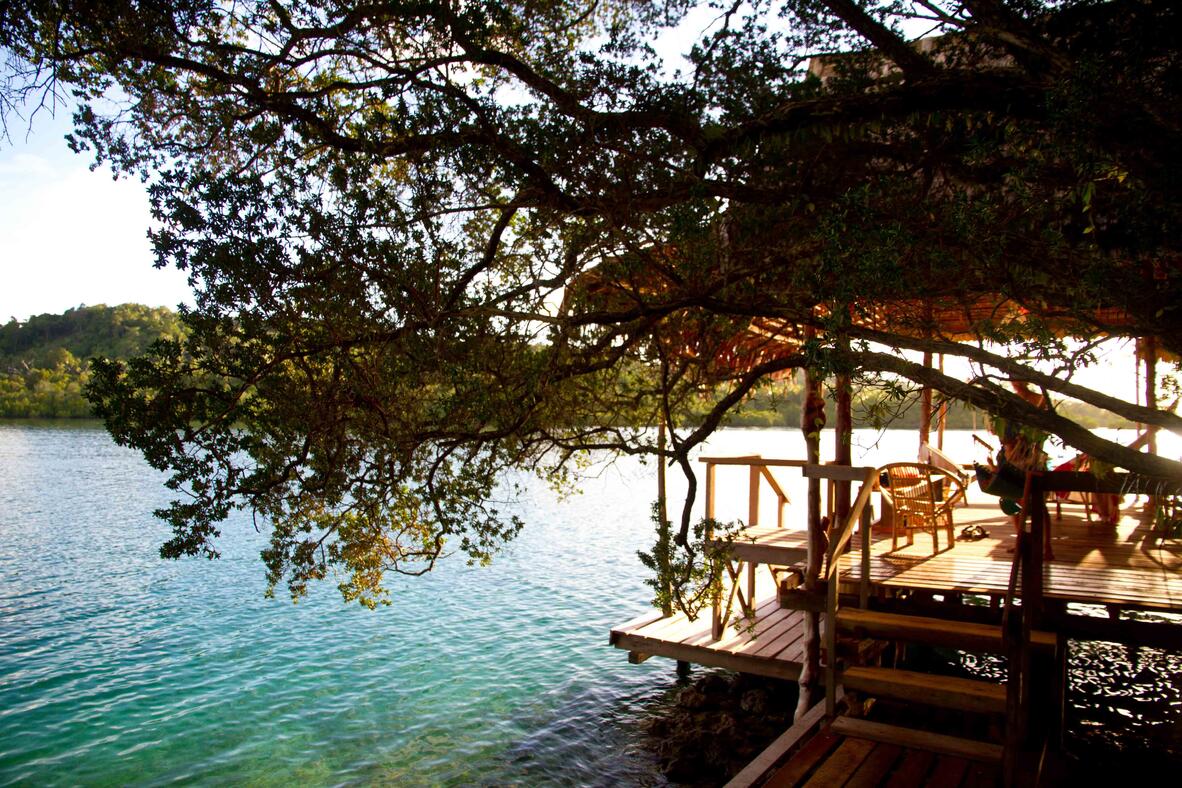 The One Bedroom Bungalow has one bedroom with double bed, plus an additional four single beds in the spacious living area. The cottage also contains a kitchenette and an indoor shower and toilet, plus an additional outdoor shower. The highlight, undoubtedly, is the over-water verandah that leads right out over a beautiful blue lagoon, complete with hammocks and deck chairs.