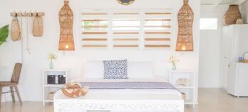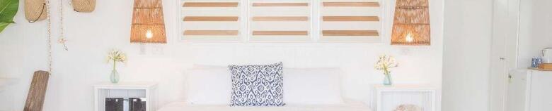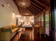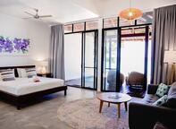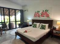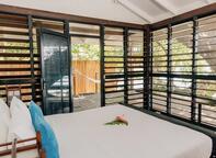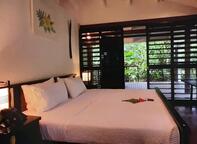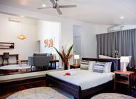 A private and spacious garden oasis with large deck and plunge pool for relaxing in at the end of the day. Large en-suite bathroom, modern furnishings, sitting area and king sized bed. All Fares at Barrier Beach Resort have modern amenities, a ceiling fan and fully screened louvered windows to allow for the beautiful breeze. This double room has a mini bar, seating area and sofa. Luxury Garden Fares normally accommodate couples, but they are able to be configured for an additional adult. Fares #14 - 16