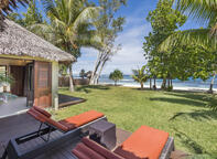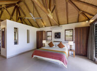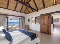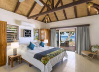 Situated on the main point of the resort with three separate pavilions, each facing a different direction to fully utilize the 180 degree views - surely one of the most beautiful views in the Pacific. The lounge room pavilion features lounge chairs, tea and coffee making facilities, bar fridge, free WiFi, Satellite TV, free movie channel and DVD player. This pavilion opens out onto a vast deck, with sun lounges, and lawn stretching out to the beach and private pavilion with sweeping views of Eratap beach and Castaway island. The bedroom wings are linked to the central lounge room pavilion by enclosed corridors. The master bedroom pavilion has a fixed king bed, is air conditioned with ensuite indoor bathroom and an outdoor shower courtyard. The second and third bedrooms share a second bathroom and contain a king size bed and two single beds and are also air conditioned. While ideally suited to larger families or two couples this villa is available to anyone wanting a very special experience.