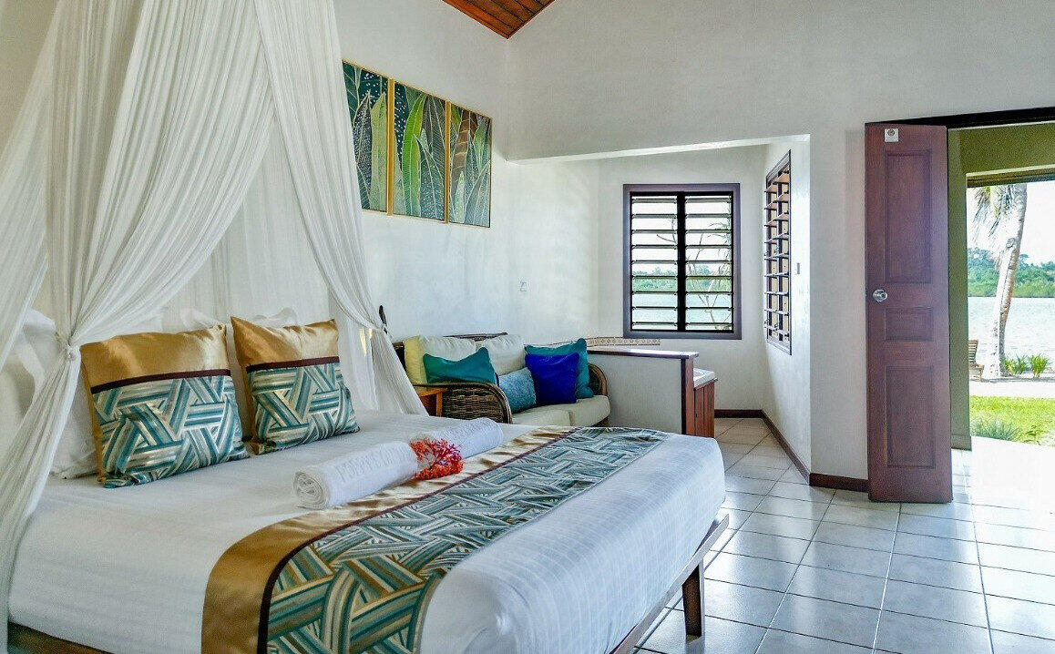 Very private free standing bure located in the adults only area of the resort with spectacular waterfront views and only 5 metres from Erakor lagoon. Fully self-contained with a private balcony and spa bath, and a romantic canopy over the bed. Amenities include gas cook top, microwave, toaster, kettle, fridge, cooking facilities, ceiling fans over bed and living area, air-conditioning.